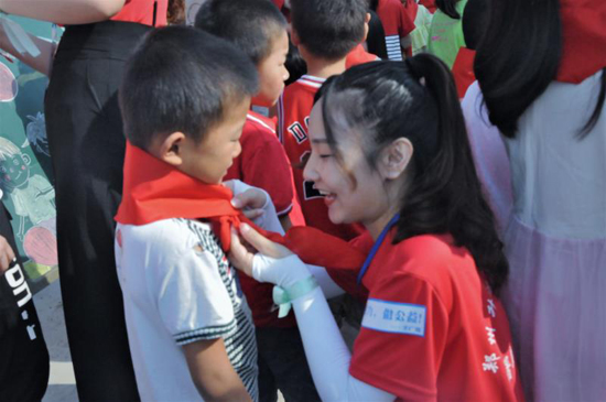 開班儀式上,鄭州升達(dá)經(jīng)貿(mào)管理學(xué)院的支教老師為同學(xué)們佩戴了紅領(lǐng)巾,伴隨著國歌進(jìn)行了升國旗教育,支教老師進(jìn)行集體宣誓。支教老師代表作表態(tài)發(fā)言時說:“很高興能夠來鹿邑周樓小學(xué)支教,作為一名當(dāng)代青年大學(xué)生,我們能夠擔(dān)當(dāng)重任,吃苦耐勞,全身心地完成兩周的支教活動,與孩子們快樂相處。”