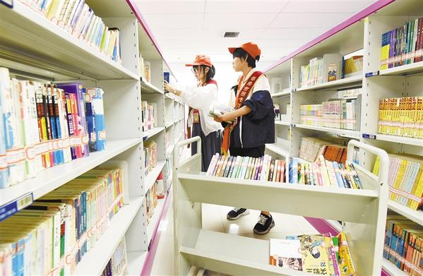 7月2日,在圖書館,參加“我當小圖書管理員”社會實踐活動的學(xué)生在整理圖書。
