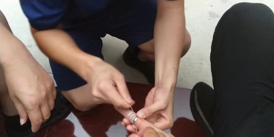 經(jīng)過查看,由于尺寸不合適,該男子左手中指已經(jīng)被戒指卡的出現(xiàn)充血,手指腫脹嚴(yán)重??紤]到用剪切器等器械剪戒指可能會傷到手指,指戰(zhàn)員利用纏線解線的方法,用細(xì)線穿過戒指在手指上纏繞,然后慢慢拉線,利用細(xì)線的滑潤效果幫助取下戒指,很快戒指被成功取下。