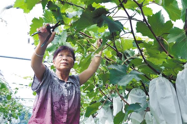 8月3日,一村婦在河南省商水縣天力葡萄種植農(nóng)民專(zhuān)業(yè)合作社為葡萄剪枝打杈。