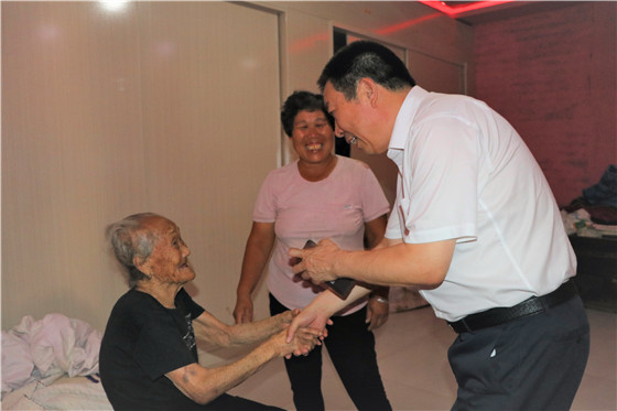 此時,張廣友岳母(一位年近九十的老人)正在內(nèi)室休息,聽到閆書記的到來,堅持從床上坐起,對閆立超一行的到來表示感謝,對黨和政府的關心關懷表示感謝。閆立超親切地握住老人的手,對她噓寒問暖,向她表示黨和政府是不會忘記她們的,要她們樹立起對生活的信心,讓她們相信生活會越來越好。