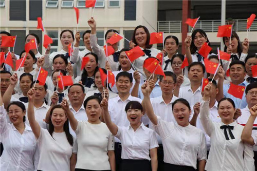 伴隨著琵琶悠揚(yáng)的旋律,在場人員揮舞手臂,舞動國旗,共同唱響《我和我的祖國》。激情澎湃的歌聲響徹第二實(shí)驗(yàn)小學(xué)每一個角落,訴說著鄲城教育人對祖國的衷心熱愛和真誠歌頌。
