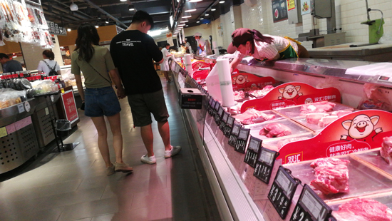 市民在中心城區(qū)一大型超市內(nèi)選購豬肉