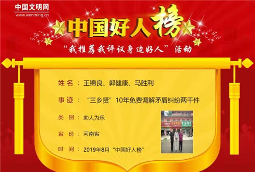 太康縣王錦良、郭健康、馬勝利在楊廟鄉(xiāng)成立幸福調(diào)解室,10年調(diào)解矛盾兩千件,成為各界美談。9月2日,8月份中國好人榜發(fā)布,該縣楊廟鄉(xiāng)幸福調(diào)解室“三鄉(xiāng)賢”同時榮登中國好人榜。截至目前,該縣入選“中國好人榜”已達(dá)60人。