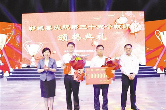 頒獎儀式上,該縣隆重表彰了2019年尊師重教先進單位、十佳師德標(biāo)兵、最具影響力校長、先進小學(xué)幼兒園、先進初中、先進中心校、2019年高招目標(biāo)管理先進單位、職業(yè)學(xué)校先進單位等。其中,獎勵鄲城一高教科研經(jīng)費245萬元、獎勵鄲城二高教科研經(jīng)費53萬元,授予縣教體局局長劉現(xiàn)營、鄲城一高校長劉成章2019年鄲城教育突出貢獻獎,并獎勵劉成章獎金10萬元。