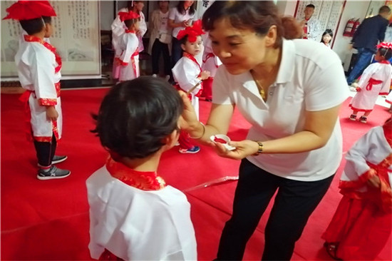 活動包含“朱砂開智”、誦讀《弟子規(guī)》、“擊鼓明志”、書畫展示、感恩五個環(huán)節(jié):第一個環(huán)節(jié)老師為孩子“朱砂開智”。用朱砂為剛剛入學的孩子在額頭正中點上紅痣,又稱之為“開天眼”。寓意著孩子從此心明眼亮,好讀書、讀好書。第二個環(huán)節(jié)老師帶領大家誦讀《弟子規(guī)》。孩子們在老師及社區(qū)工作人員帶領下誦讀國學經(jīng)典《弟子規(guī)》,一起感受儒家經(jīng)典的道德教化魅力。第三個環(huán)節(jié)是“擊鼓明志”。擊鼓明志是結合中國傳統(tǒng)文化,讓孩子們通過擊打中國鼓,以鼓聲的清脆悅耳,來提高孩子的精氣神,激發(fā)孩子們的斗志,給孩子們建立濟世救人,胸懷天下的抱負,從而也讓孩子們表達出人生理想,為未來的人生目標努力奮斗。“我長大想當一名醫(yī)生,可以治病救人……我長大想當一名消防員,在著火的時候奔赴火場救人……我長大想當一名古箏老師,登上世界舞臺彈奏好聽的音樂……”孩子們依次擊鼓并說出了人生理想抱負。第四個環(huán)節(jié)是書畫展示。繪畫創(chuàng)作讓孩子們靜定心靈,激發(fā)智慧。第五個環(huán)節(jié)是感恩環(huán)節(jié),感恩老師、感恩父母、感恩天地萬物,以此培養(yǎng)孩子們向善向上的健康思想,增強他們的社會責任感,進一步引導他們常懷感恩之心。