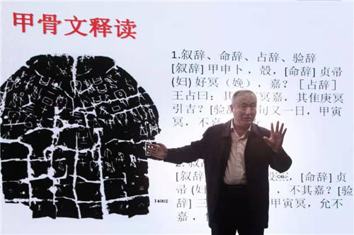 接著,在歷時兩個半小時的分享中,郝教授以融合發(fā)現、甲骨文字拆分、甲骨文書風及甲骨文書法創(chuàng)作為立足點,襯以個人習書作品,從文化本義的內涵、文化本義的要素、文化的生成和甲骨文的演化和發(fā)展等方面詳細闡述了文化的來源以及人類社會進步的過程。