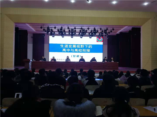 甘諾教授以“生涯教育視野下的高中和高校銜接”為題,從“職業(yè)生涯喚醒、興趣能力與文理分科、走進象牙塔、外面的世界很精彩”四個方面做了精彩報告,并對選科依據(jù)、基本原則、高校錄取及志愿填報應注意的問題進行了詳細的解讀,還就大學大類招生及霍蘭德職業(yè)興趣測評個性特質與大學專業(yè)分類如何匹配進行了專業(yè)分享。