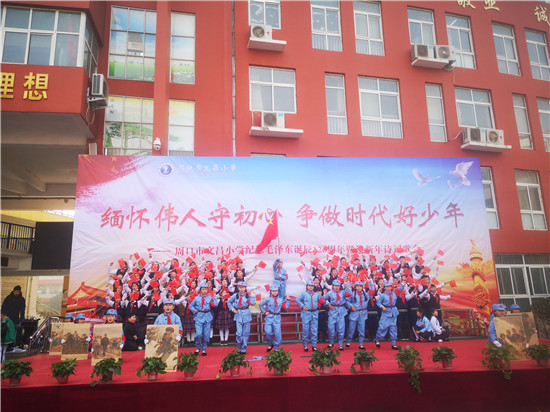 “東方紅,太陽升,中國出了個(gè)毛澤東,他為人民謀幸?!被顒?dòng)在校長朱剛偉的一首《東方紅》 中拉開了帷幕。朱剛偉向全體學(xué)生講述了毛主席一生為人民,一世為民族的偉績,并希望全體學(xué)生牢記12月26日這個(gè)難忘的日子,牢記毛澤東思想,不忘革命先輩,爭做新時(shí)代好少年。