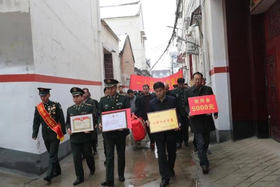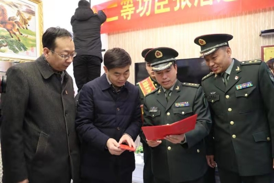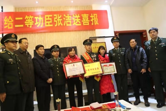 隨后,周口軍分區(qū)政治部主任李揚,太康縣委副書記、政法委書記劉海艇,縣委常委、副縣長韓維俊,縣委常委、人武部部長于永前,人武部政委郭立君等領導給張潔的母親盧靈芝送去了立功喜報、二等功臣家庭牌匾和慰問品、慰問金。
