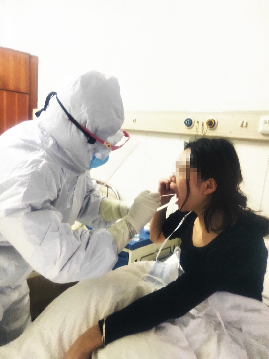 “第一次給疑似病人采集咽拭子時(shí),說實(shí)話,難免有點(diǎn)緊張。病人張大嘴巴,棉簽剛一伸進(jìn)去,他就干嘔起來,然后猛烈嗆咳,連續(xù)兩次才完成采樣?!焙粼趧倓偨Y(jié)束一例標(biāo)本采集后說:“現(xiàn)在,我都是下手又快又準(zhǔn),避免病人干嘔和嗆嗽?!?/p>