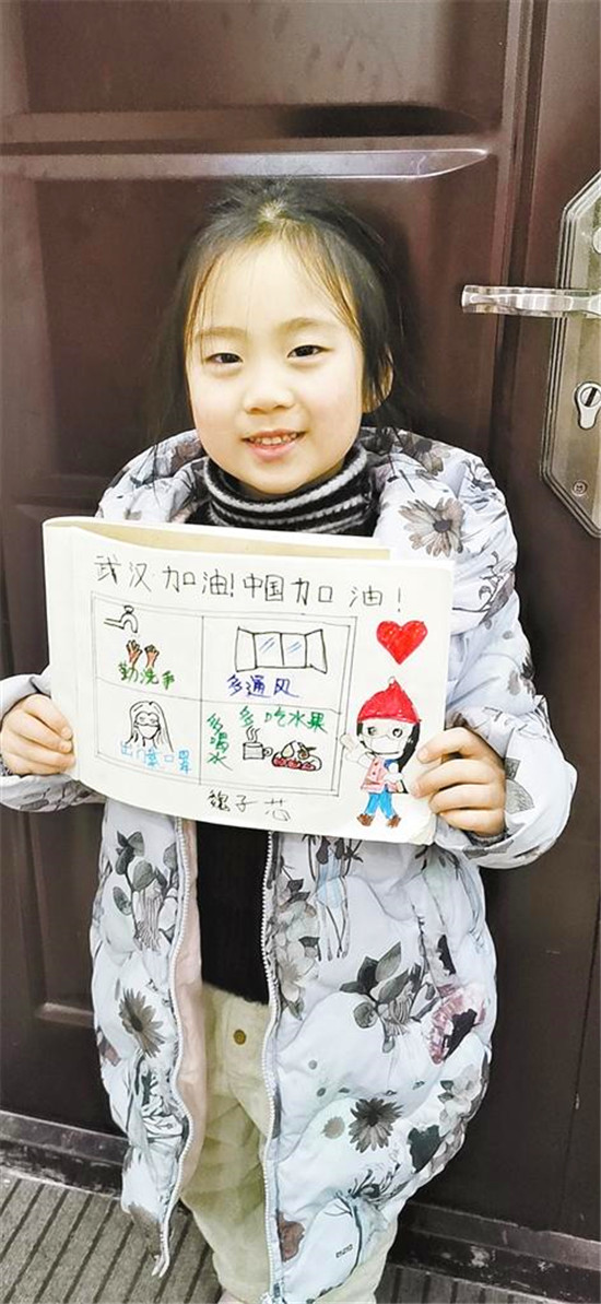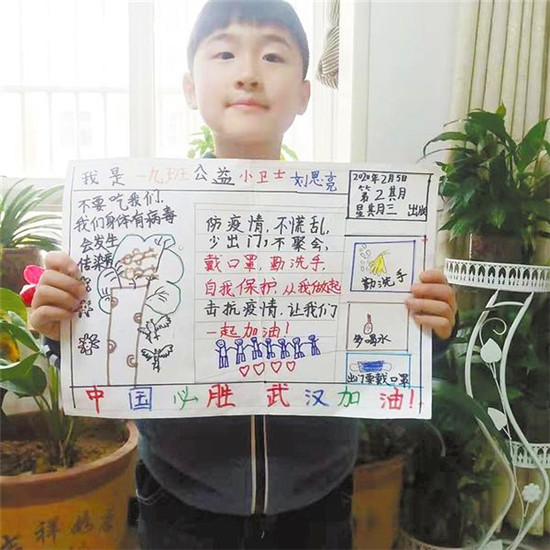 周口六一路小學(xué)近日布置了一項(xiàng)作業(yè),要求學(xué)生設(shè)計(jì)一張防疫宣傳小報,為武漢加油。該校學(xué)生用漫畫的形式呼吁大家勤洗手、戴口罩、多喝水、多通風(fēng)。記者 王晨 通訊員 李琨 攝