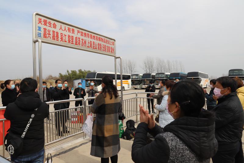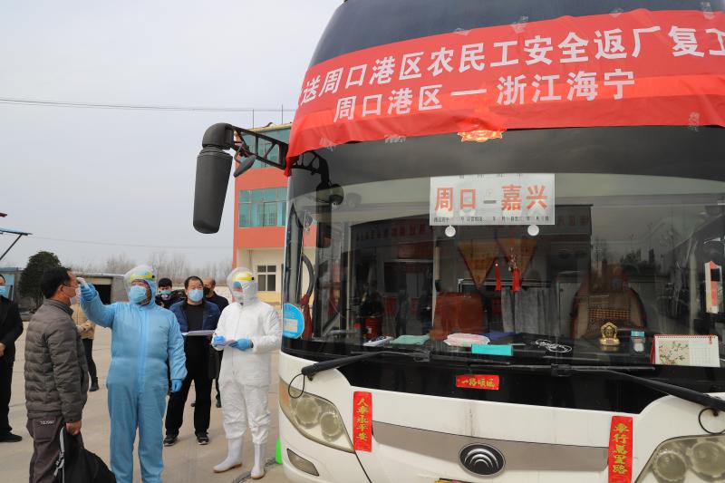 2月20日下午,24名農(nóng)民工從港區(qū)汽車站上車,8個(gè)小時(shí)后,他們將直接到達(dá)位于浙江海寧市的一家企業(yè)廠區(qū)。疫情防控期間,為方便居民外出務(wù)工,避免旅途過(guò)程中的交叉感染,周口港區(qū)采用“點(diǎn)對(duì)點(diǎn)”的形式,組織車輛幫助農(nóng)民工返崗。發(fā)車前,港區(qū)管委會(huì)主任程若光攜食品、飲料到場(chǎng)為司乘人員送行,并叮囑他們旅途中做好安全防護(hù)。