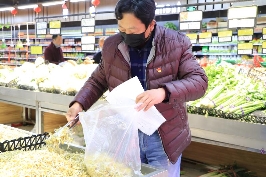 上午9時(shí)許,許新衛(wèi)把微信上的“菜譜”抄到紙上,然后開(kāi)著他的五菱宏光面包車,來(lái)到村北頭的好又多購(gòu)物廣場(chǎng)。記者看到,購(gòu)物廣場(chǎng)門口的工作人員對(duì)每一名進(jìn)入超市的人員都要進(jìn)行體溫檢測(cè)。進(jìn)入購(gòu)物廣場(chǎng)內(nèi)部,市場(chǎng)內(nèi)物資充足、品種齊全、擺放有序,所有人員都戴著口罩。前來(lái)購(gòu)物的大多是附近的村民。