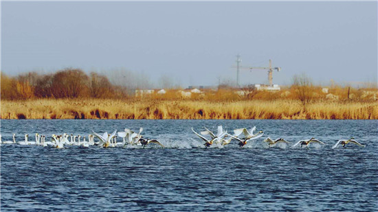 2月21日,50多只白天鵝在國(guó)家濕地公園淮陽(yáng)龍湖自由游弋、展翅翱翔的美麗畫(huà)面被記者一一收入鏡頭。記者現(xiàn)場(chǎng)看到,初春的龍湖,天藍(lán)水碧,萬(wàn)物萌動(dòng)。這群白天鵝的到來(lái),使萬(wàn)畝龍湖一下子變得靈動(dòng)起來(lái)。它們有的在水面上自由覓食,一副悠然自得的神態(tài);有的時(shí)而煽動(dòng)翅膀,抖落長(zhǎng)途跋涉的疲憊;有的飛向藍(lán)天,盡情享受著春日暖陽(yáng)。為了不打擾這群“客人”,又能拍攝到相對(duì)清晰的圖片,記者環(huán)繞龍湖多處踩點(diǎn),用200mm鏡頭+2倍增距鏡,蹲守一天,最終在畫(huà)卦臺(tái)前湖岸向東南方向遠(yuǎn)距離拍攝到了這些美麗的畫(huà)面。