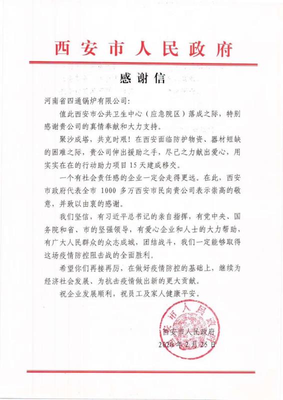 “聚沙成塔,共克時(shí)艱!在西安面臨防護(hù)物資、器材短缺的困難之際,貴公司伸出援助之手,盡己之力獻(xiàn)出愛(ài)心,在此西安市政府代表全市1000多萬(wàn)西安市民向貴公司表示由衷的感謝”。這是西安市政府對(duì)太康縣拔尖人才、河南省四通鍋爐有限公司總經(jīng)理馮坤的感謝信。一方有難,八方支援。在新聞上了解到武漢新冠肺炎疫情突發(fā)的情況后,他連夜與中國(guó)紅十字會(huì)和武漢紅十字會(huì)取得聯(lián)系,詢問(wèn)向新建的火神山醫(yī)院捐贈(zèng)醫(yī)用鍋爐和捐款事宜,通過(guò)網(wǎng)上銀行將30萬(wàn)善款轉(zhuǎn)入武漢紅十字會(huì)賬戶中。