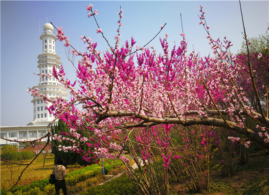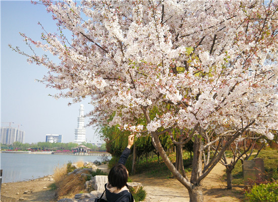 3月24日,周口公園內櫻花、海棠、桃花、紫荊花爭相綻放,在綠樹的映襯下,遠看猶如濃彩重墨的百花圖,不少市民來此賞花游玩。