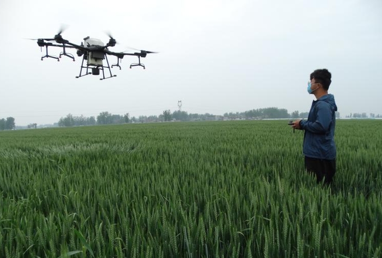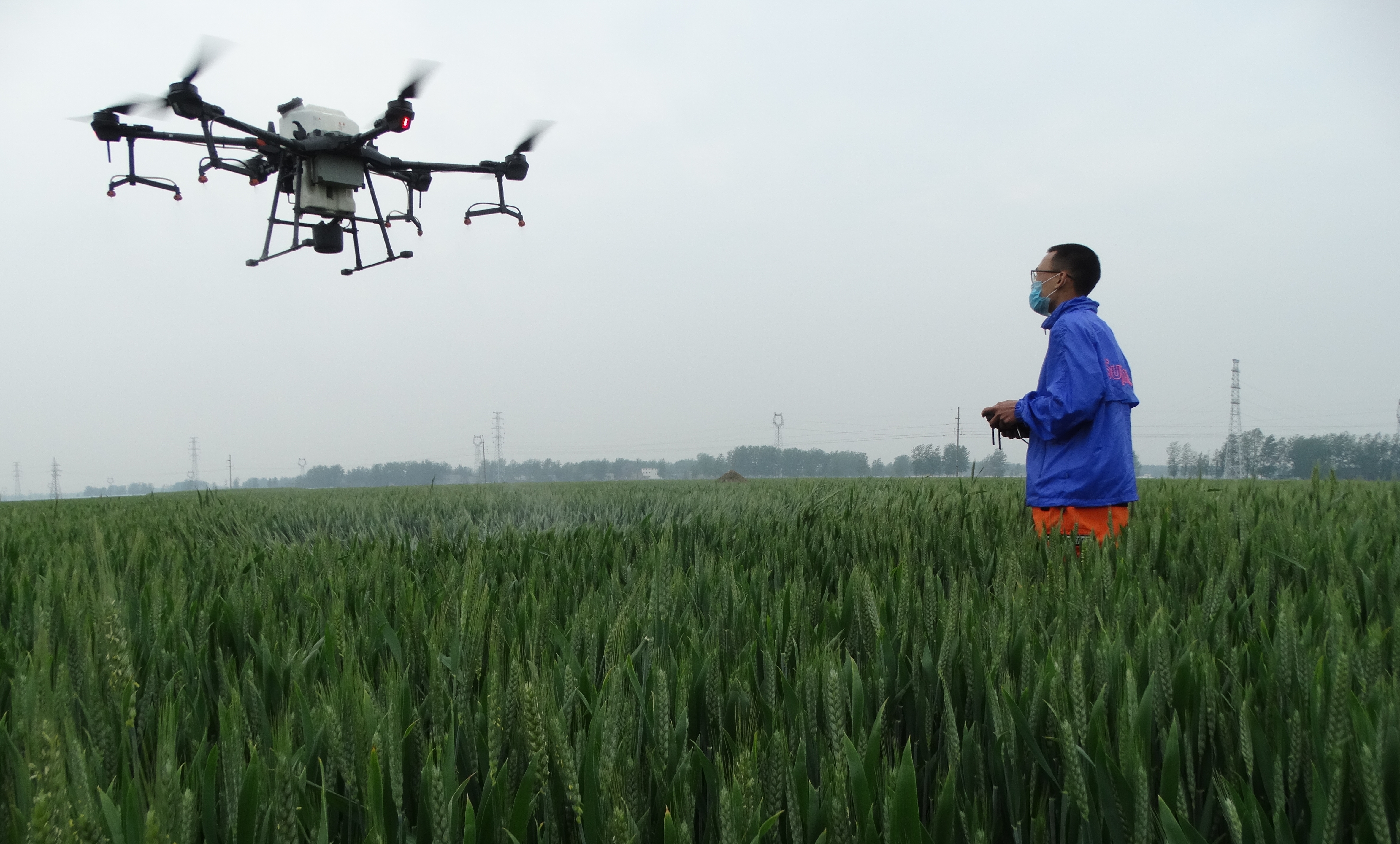 4月18日,沈丘縣周營(yíng)鎮(zhèn)王寨村小麥高產(chǎn)示范基地,飛防技術(shù)人員在操作無(wú)人機(jī)進(jìn)行“一噴多防”作業(yè),噴施“防治病蟲(chóng)害+強(qiáng)筋壯骨增產(chǎn)營(yíng)養(yǎng)液”套餐。
