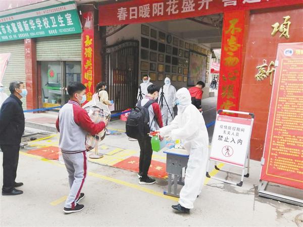 在周口十九中,記者看到,一大早,該校全體教職員工就已準備就緒,分別在校門口和教室內等候初三學子的到來。據(jù)了解,復學首日,該校安排了60余名教師在校門口維持秩序,此時的他們既是安全員又是防疫員。