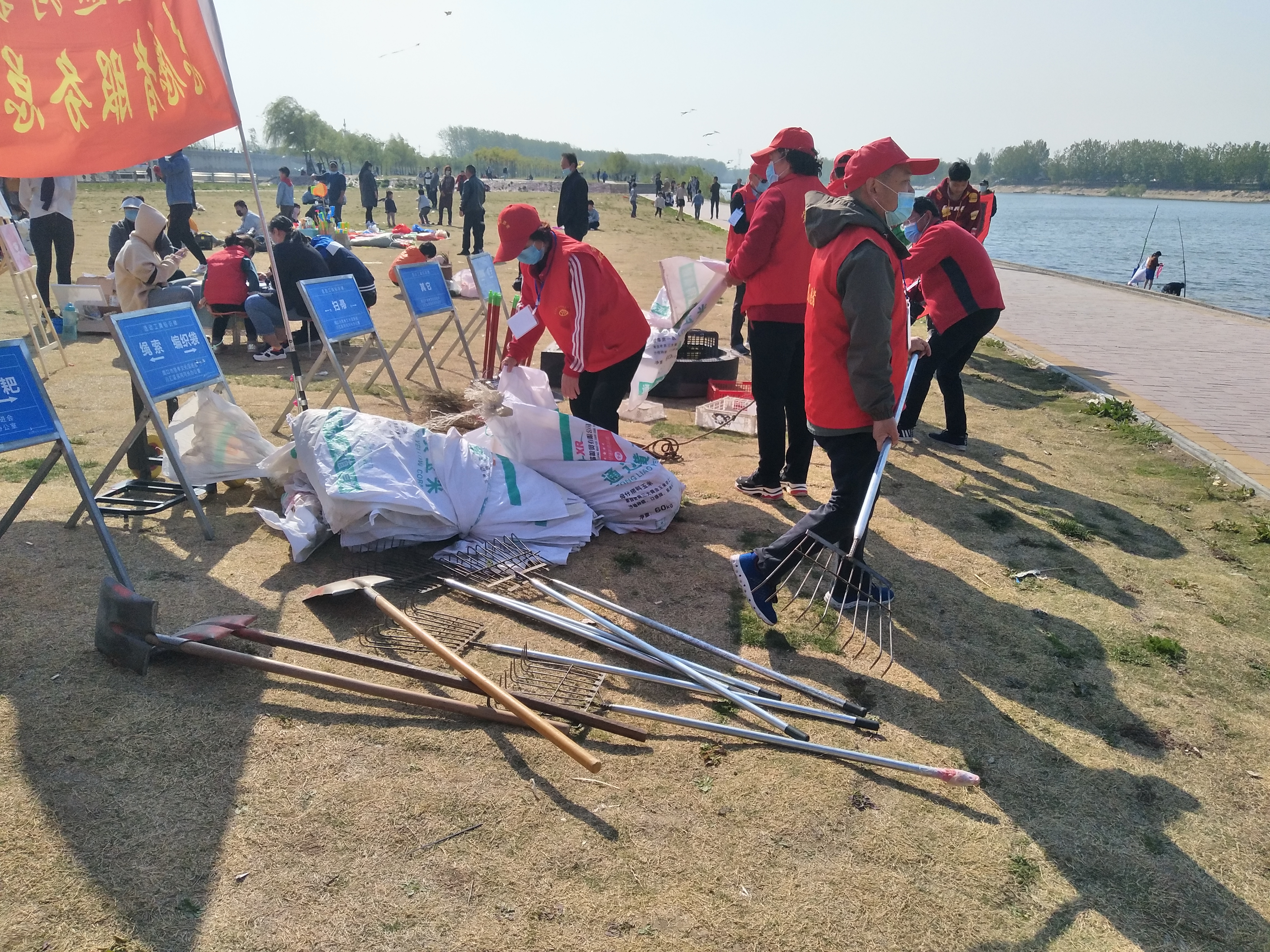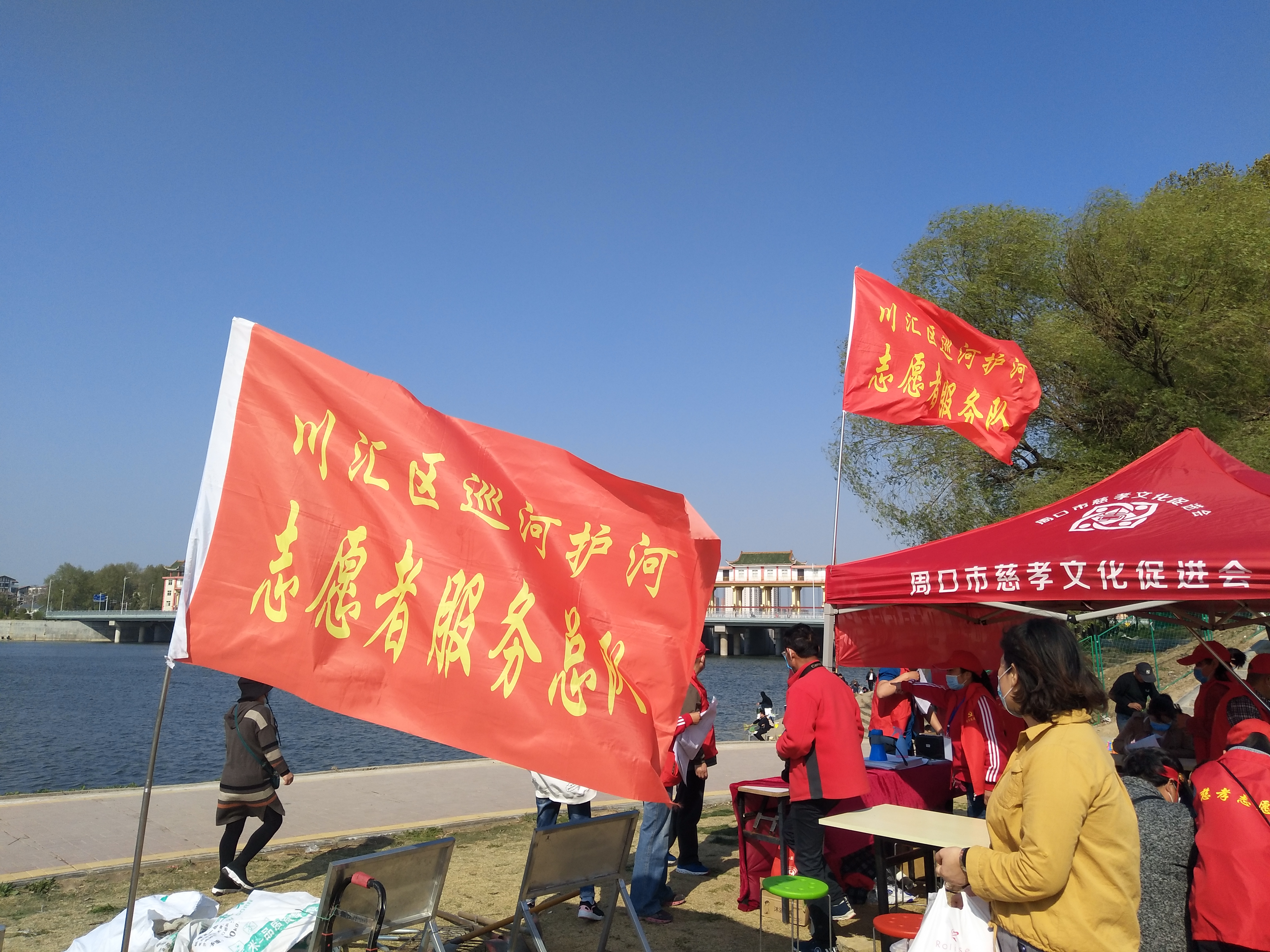 問(wèn)卷棚旁是擺放整齊的河面垃圾清理工具,鐵锨、鐵耙、繩索、編織袋、掃帚、垃圾箱一字排開,寫有“川匯區(qū)巡河護(hù)河”、“志愿者服務(wù)總隊(duì)”字樣的紅旗迎風(fēng)飛揚(yáng)。記者向志愿者借了身衣服,和大家一起等著護(hù)河總指揮孫彩云分工。