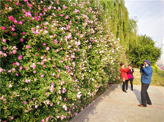 4月23日,市民從繁花滿枝狀如“瀑布”的刺玫花下走過。市體育館西南角的刺玫花正在熱烈綻放,團團簇簇綴滿枝頭,遠遠望去,宛如彩色的“瀑布”一瀉而下。不少市民在花墻前拍照、玩耍,成為市民們“打卡”地。