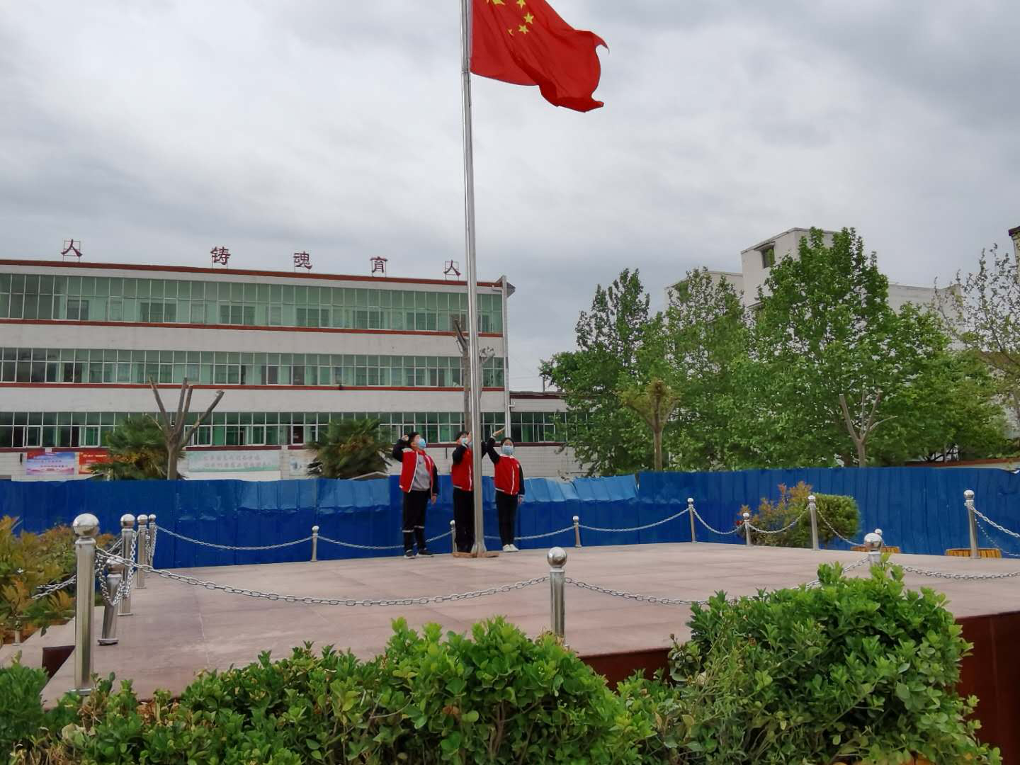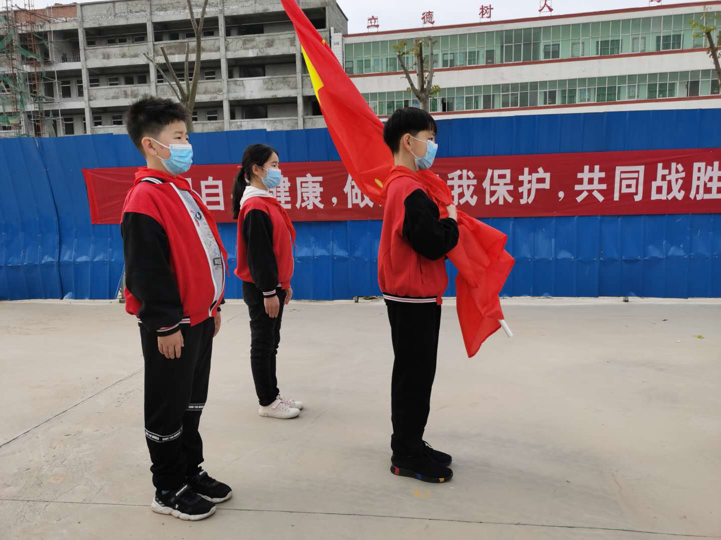 這是一次特殊的升國旗儀式,三名國旗手在操場上將五星紅旗冉冉升起,升旗實況同步轉(zhuǎn)播到教室內(nèi)的電視屏幕上,同學們在各自教室里面向國旗莊嚴肅立、齊唱國歌,面向國旗敬禮,在國旗下立下一個志,將來成為一個對社會有貢獻的人,能夠為社會做出突出成績的人。