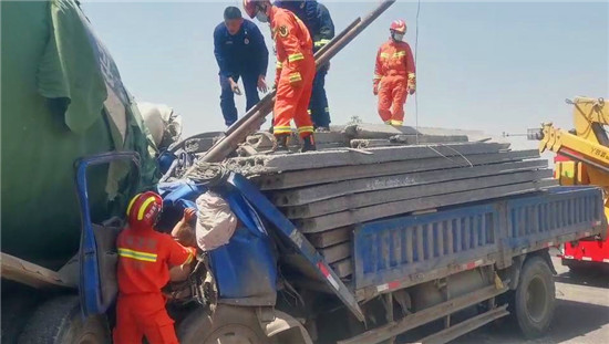 4月26日11時許,西華縣逍遙鎮(zhèn)加河灘村穎河橋發(fā)生一起車禍,一輛拉石板的貨車和一輛水泥罐車相撞,貨車在強(qiáng)大的慣性下車頭嚴(yán)重變形,司機(jī)被困車中,而貨車的駕駛室也被由于慣性發(fā)生前傾的石板壓住,情況十分緊急。周口市消防救援支隊西華縣消防大隊接到報警后立即出動2車10人趕赴現(xiàn)場展開救援。