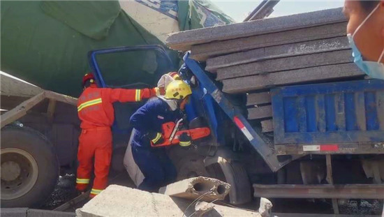 據(jù)了解,由于兩車相撞產(chǎn)生的沖擊力導(dǎo)致貨車與水泥灌車的車體緊緊連在一起,貨車駕駛員被卡在駕駛位上無法動彈。為了能盡快將被困司機(jī)救出來,現(xiàn)場指揮員指揮救援人員協(xié)助現(xiàn)場交警、路政部門立即對事故路段進(jìn)行封鎖處理,并設(shè)置安全員對過往車輛進(jìn)行警示,保證救援工作正常開展。同時,另一組救援人員首先對壓住駕駛室的石板進(jìn)行清理,然后使用液壓器材工具組進(jìn)行破拆,并對駕駛員腿部被擠壓部位進(jìn)行擴(kuò)張。經(jīng)過十五分鐘的緊急救援,被困司機(jī)被成功救出后移交現(xiàn)場救護(hù)車送往醫(yī)院治療。