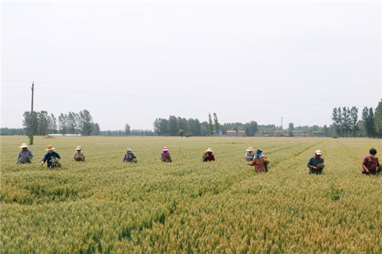 5月16日,記者在鹿邑縣棗集農(nóng)場看到,2800多畝的良種小麥繁育基地里50多人分成四支隊伍一字排開,在綠波碧浪的小麥田里認(rèn)真排查、進(jìn)行提質(zhì)去雜工作。