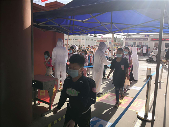 當(dāng)日上午7時許,準(zhǔn)備入校的項(xiàng)城市蓮溪小學(xué)學(xué)生在校門口值守老師及防疫人員的指揮下,排隊依次有序檢測體溫后,按照指定路線步入校園。為實(shí)現(xiàn)“科學(xué)有效防控,安全有序開學(xué)”,學(xué)校要求全校師生認(rèn)真填寫“一碼一書”、嚴(yán)格實(shí)施“1米線”、堅持做到“晨午檢”?!昂⒆釉谶@里很安全,我們很放心。”學(xué)生在蓮溪小學(xué)三年級就讀的家長袁先生說。