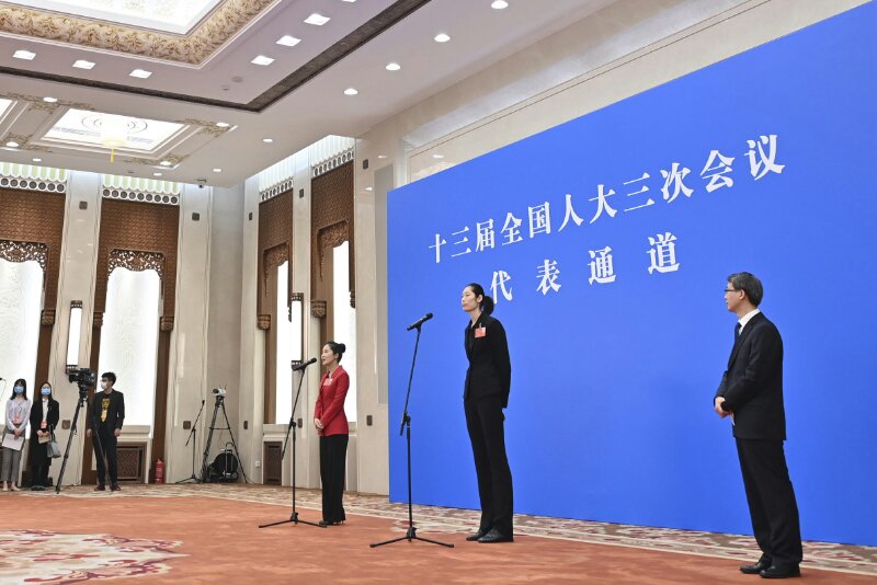 5月22日,第十三屆全國(guó)人民代表大會(huì)第三次會(huì)議舉行首場(chǎng)“代表通道”采訪活動(dòng)。這是全國(guó)人大代表朱婷(右二)通過網(wǎng)絡(luò)視頻方式接受采訪。新華社記者 劉金海 攝