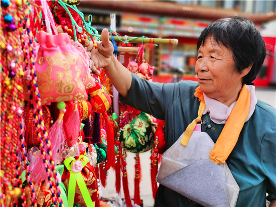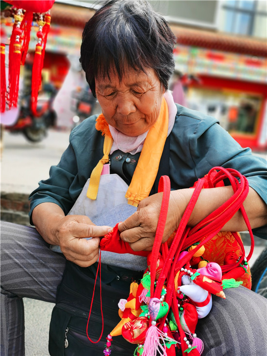 6月4日,呂大媽在懸掛剛做好的香包。端午節(jié)臨近,我市城區(qū)大街小巷,各種形象生動(dòng)、精致可人的香包深受市民喜愛。