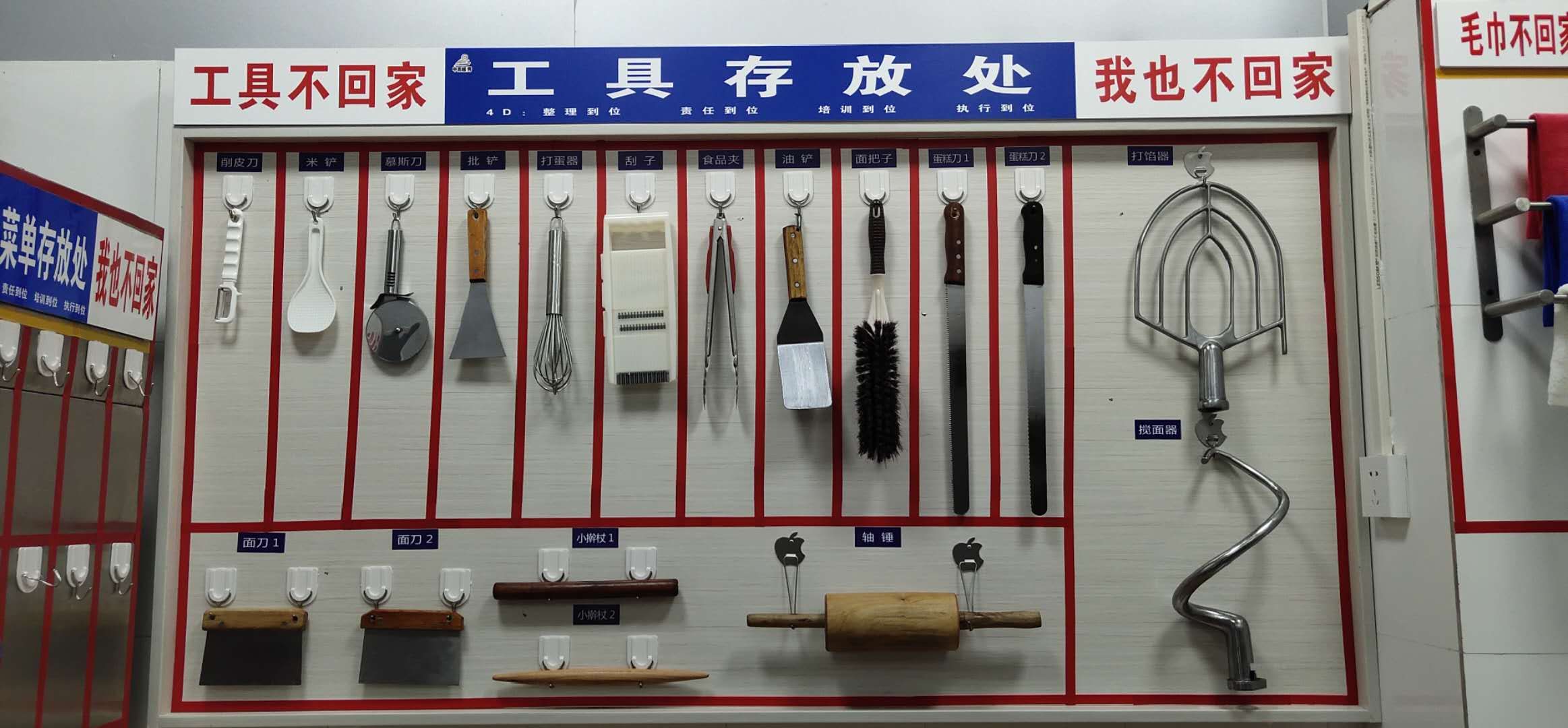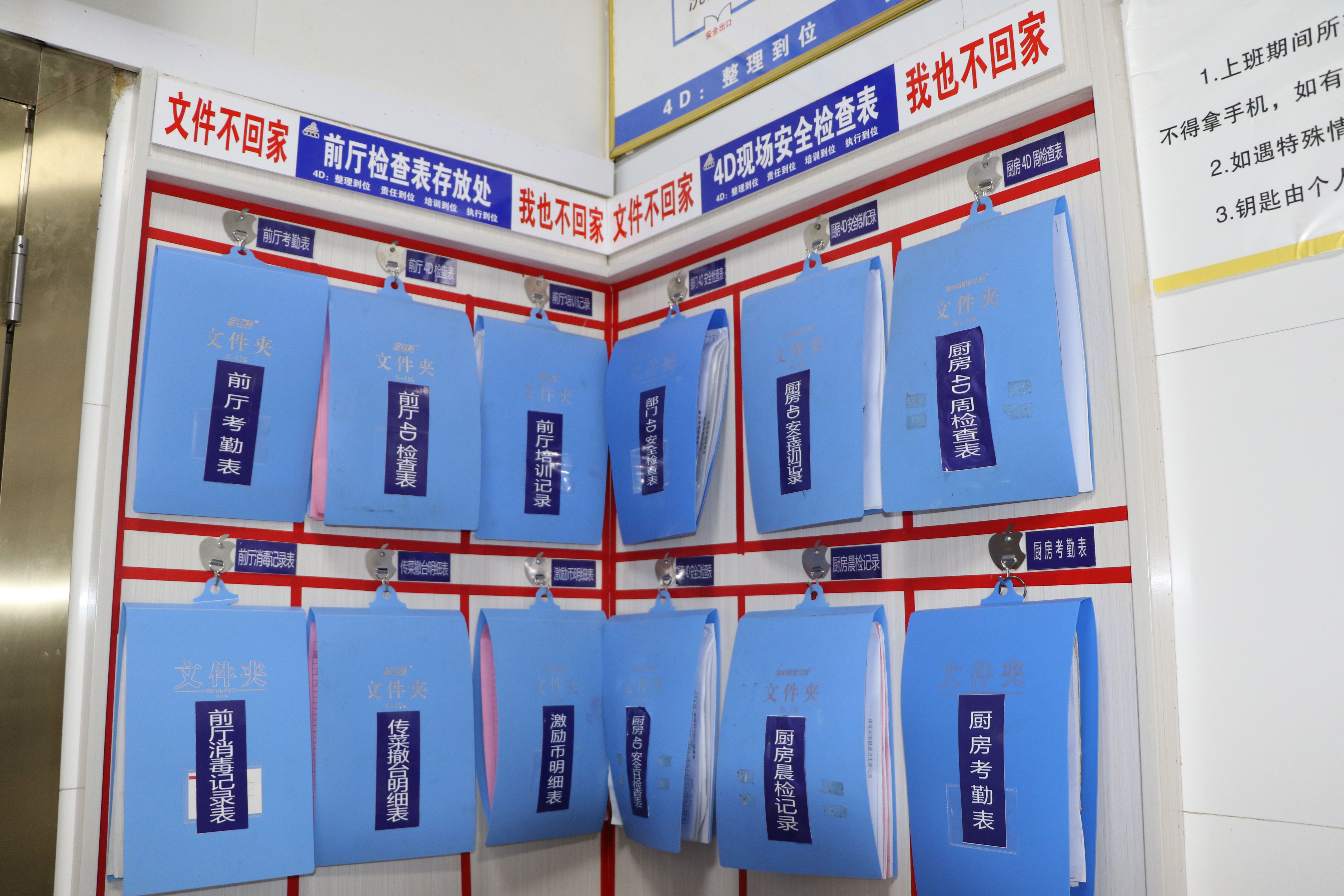 走進體育賓館廚房,一切干凈整潔、井然有序。擦拭不同物品的毛巾、切不同菜品的菜刀和案子統(tǒng)統(tǒng)用不同顏色標示,便于區(qū)分,不致交叉使用;進出貨方向,行走方向,人員和工具去向,標示清楚,一目了然;區(qū)域衛(wèi)生責任每個分區(qū)都有負責人的姓名及照片和嚴謹?shù)墓ぷ饕?guī)則;垃圾分類處理,垃圾桶全部封閉,并且還放置在專門的柜子中;各種臺賬一目了然,供應(yīng)商產(chǎn)品資質(zhì)清晰,采購、驗收、加工、出品整個過程都有專門的人員嚴格把關(guān);“三防”工具齊全,措施完備,沒有絲毫漏洞;泔水處理專人負責,有臺賬,有監(jiān)督,就連拖把也有準確的標示,且有固定的柜子存放......