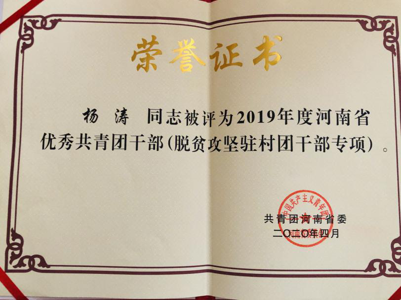 由于扶貧工作和駐村團工作成績突出,楊濤先后被共青團河南省委評為2019年度“河南省優(yōu)秀共青團干部”,被共青團周口市委授予“周口市優(yōu)秀共青團干部”。
