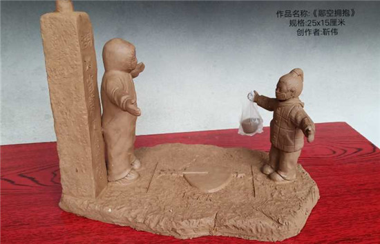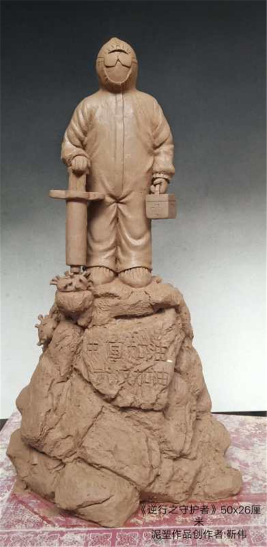 所捐《逆行之守護(hù)者》泥塑作品,高50厘米,寬26厘米,描述全副武裝的醫(yī)護(hù)工作者一手握針管殺死病毒,一手提藥箱救人,謳歌了疫情中逆行的醫(yī)護(hù)工作者不畏犧牲、與新冠病毒搏斗,冒死救治病毒感染者的偉大精神。《隔空擁抱》是講述我市扶溝縣人民醫(yī)院抗疫故事,疫情期間奮戰(zhàn)在抗疫一線的劉海燕醫(yī)生和為自己送年夜飯的女孩隔空擁抱的感人場景,讓無數(shù)人熱淚盈眶。