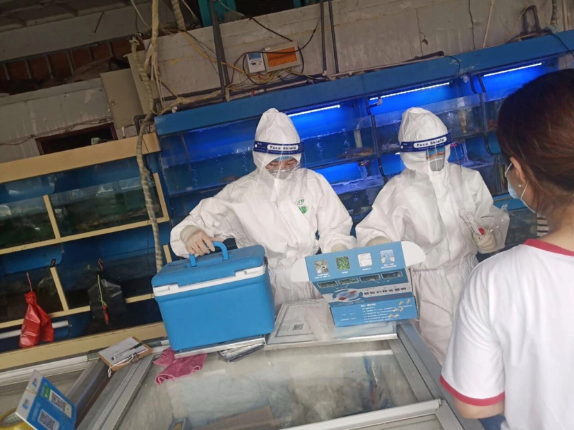 當(dāng)日,分別對6月14日排查中發(fā)現(xiàn)的一箱三文魚、銷售三文魚的電子秤、分割案板等相關(guān)器具進行了核酸檢測,隨后又對周邊經(jīng)營進口凍品的人員及相關(guān)產(chǎn)品也進行抽樣檢測。抽樣完畢后,市場監(jiān)管分局執(zhí)法人員繼續(xù)對市場內(nèi)的水產(chǎn)品批發(fā)經(jīng)營區(qū)進行檢查,查看商戶的相關(guān)資質(zhì)和經(jīng)營環(huán)境,檢查了海鮮類產(chǎn)品的進貨渠道及相關(guān)檢疫證明等,共計檢查海鮮商戶5戶、凍品商戶7戶、水產(chǎn)區(qū)商戶8戶,未發(fā)現(xiàn)由北京新發(fā)地市場進口的三文魚類海鮮產(chǎn)品及國外重點疫區(qū)進出口水產(chǎn)品。