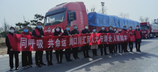 “萬眾一心,共抗疫情,周口人民與湖北人民并肩作戰(zhàn)!”2月29日10時,6輛懸掛著紅色條幅的卡車,滿載100噸新鮮蔬菜在周口北高速口集合后,踏上了馳援湖北孝感的征程,單慶峰專門趕到現(xiàn)場為車隊送行。