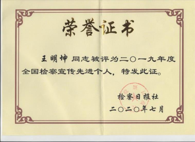 近年來,王明坤同志始終堅(jiān)持以文字服務(wù)大局、服務(wù)干警、服務(wù)一線。不管忙閑,始終堅(jiān)持新聞寫作,不斷捕捉每名干警身上的閃光點(diǎn)、每個(gè)案件特殊點(diǎn)、每件工作的新聞眼,不斷宣傳身邊的正面典型人物和事件。十多年在各級(jí)報(bào)刊發(fā)表稿件130余篇,其中《檢察日?qǐng)?bào)》用稿36篇,各級(jí)網(wǎng)絡(luò)媒體采用220余篇,全方位、多角度宣傳太康縣院執(zhí)法辦案的工作動(dòng)態(tài)、工作成績(jī)、工作效果、工作面貌,并為多家媒體提供稿件及優(yōu)秀圖片、視頻。太康宣傳工作多年來保持在全市領(lǐng)先,太康縣人民檢察院連續(xù)10年榮獲“全國(guó)檢察宣傳先進(jìn)單位”,有力的助推了太康檢察工作發(fā)展。2019年7月,王明坤同志被最高檢《檢察日?qǐng)?bào)》社評(píng)為“全國(guó)檢察宣傳先進(jìn)個(gè)人”。