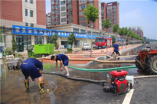 為加快排水速度,港區(qū)在匯林大道增設(shè)一個(gè)臨時(shí)提泵站,以每小時(shí)1200立方米的速度,開足馬力,全天排水。同時(shí),安排工作人員24小時(shí)值班,緊盯排水動(dòng)態(tài),及時(shí)清除泵站格柵垃圾,將雨水順利排至沙潁河,減少道路雨水負(fù)載量。針對(duì)社區(qū)和道路積水情況,各職能部門調(diào)集全部可調(diào)動(dòng)的潛水泵,迅速排出社區(qū)和道路積水。