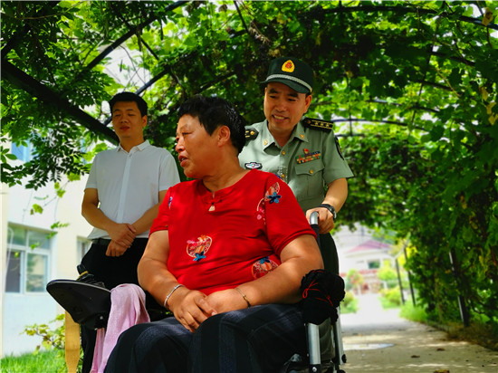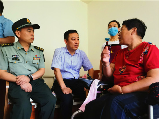 走進位于太昊路上的周口市老年護理院,院內(nèi)整潔有序、花蕊吐香鳥鳴聲聲,小徑通幽處的涼亭內(nèi)三五老人打牌、聊天,一副愜意安詳?shù)纳顖鼍?。在侯國領(lǐng)母親王玉勤居住的房間內(nèi),李揚、孫光濤等人坐在床邊與她聊天談心,看到這么多人來慰問她,王玉勤眼中流下了感動的眼淚,她對慰問人員表示感謝,說自己來護理院近一年來,吃住條件都不錯,護理院照顧的無微不至,身體一天天恢復,閑暇時還能不依賴輪椅自己走上一段路。她激動地說:“感謝黨和政府的親切關(guān)懷,我最大的愿望是希望倆兒子永遠聽黨的話,在部隊安心服役、再立新功,用優(yōu)異的成績回報黨和政府對我們?nèi)业年P(guān)愛。”