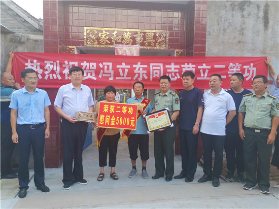 8月1日,淮陽(yáng)區(qū)人武部負(fù)責(zé)人李保祥與該區(qū)退役軍人事務(wù)局局長(zhǎng)董天祥等人一起,帶著二等功喜報(bào)及慰問(wèn)金,專程趕往該區(qū)四通鎮(zhèn)葉莊行政村前馮橋村現(xiàn)役軍人馮立東家中。此時(shí),村里鑼鼓隊(duì)敲響了,村民走出家門紛紛前來(lái)觀看,頓時(shí)贏得村民的一片喝彩及點(diǎn)贊聲。許多村民說(shuō):“孩子在部隊(duì)立功授獎(jiǎng),作為軍屬可真是光榮呀!”(記者孫安平 通訊員 張然 張航碩 攝影報(bào)道)
