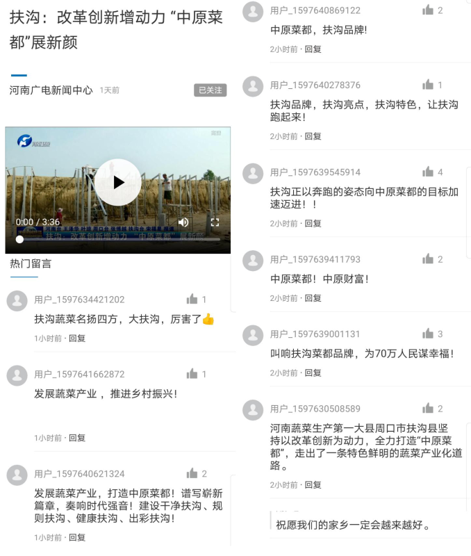 “扶溝蔬菜產(chǎn)業(yè)大發(fā)展,助推扶溝社會(huì)經(jīng)濟(jì)再上新臺(tái)階?!薄胺鰷鲜卟嗣麚P(yáng)四方,大扶溝,厲害了?!薄敖许懼性硕计放?,樹(shù)立經(jīng)濟(jì)社會(huì)發(fā)展良好形象,讓扶溝跑起來(lái)?!本W(wǎng)友們紛紛跟帖評(píng)論為自己的家鄉(xiāng)點(diǎn)贊。
