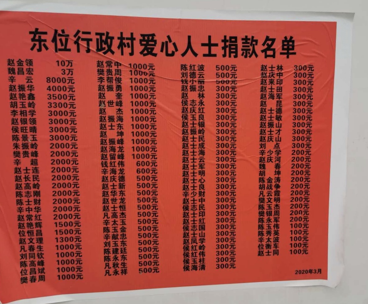樊玉周向記者展示了兩份成績(jī)單:第一份是大家捐款明細(xì)。第二份便是鄉(xiāng)賢響應(yīng)黨委政府號(hào)召參與美麗東位建設(shè),為村莊帶來(lái)的新變化:實(shí)施坑塘改造1處面積300平方,道路硬化810米,硬化胡同5條700米并完善排水管道,綠化面積2600平方米,新建文化廣場(chǎng)3座,實(shí)施高標(biāo)準(zhǔn)農(nóng)田水利建設(shè),溝渠治理2800米,新挖機(jī)井45口,旱廁改造率80%以上,自來(lái)水、寬帶網(wǎng)絡(luò)實(shí)現(xiàn)全覆蓋,電網(wǎng)進(jìn)行了全面改造,9個(gè)自然村路燈全覆蓋,趙莊自然村監(jiān)控全覆蓋……