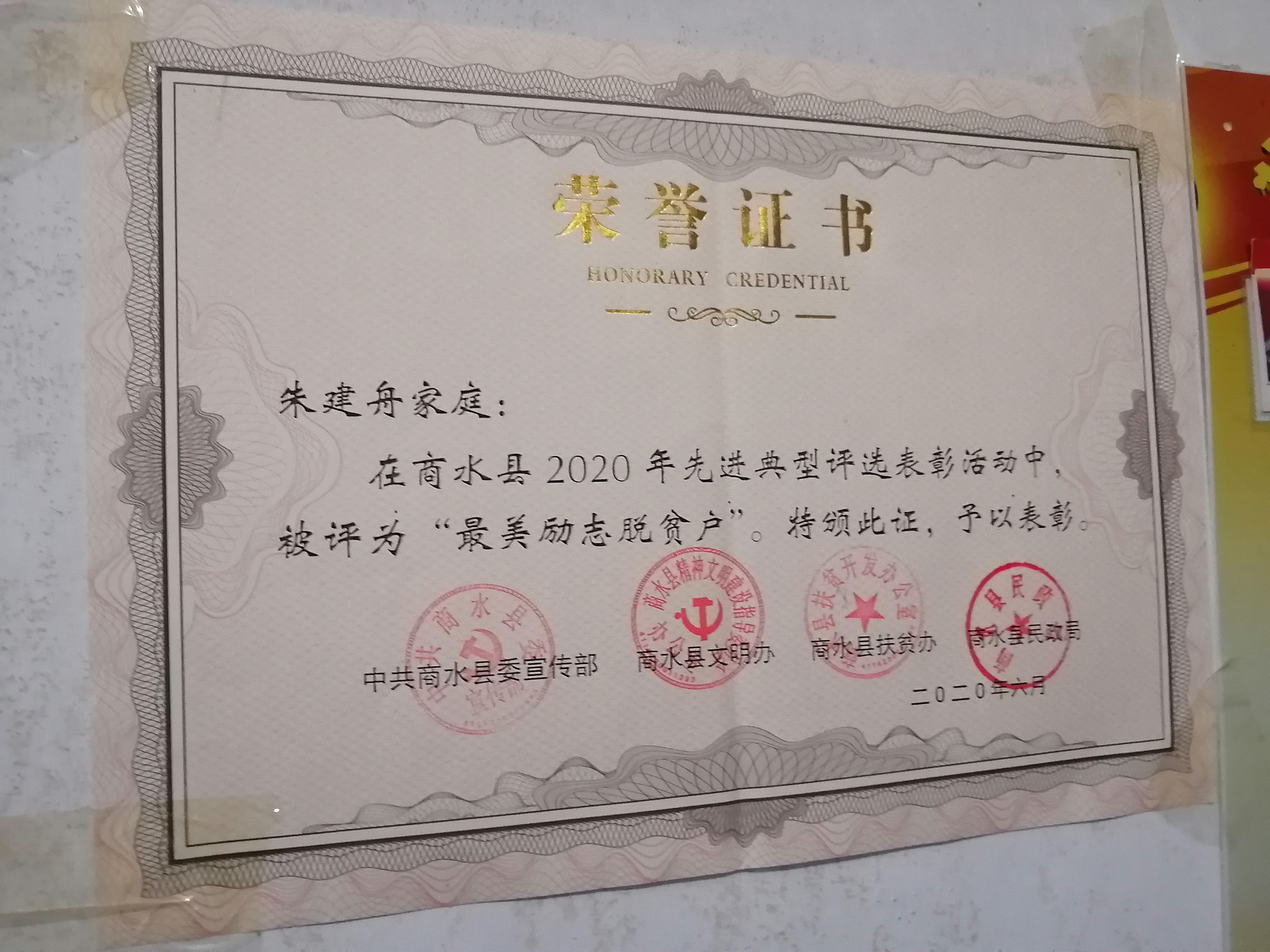 由于鄉(xiāng)村干部和駐村工作隊(duì)的大力幫扶,加上朱建舟夫妻二人勤勞能干,在2018年順利脫貧。同時(shí),他被朱屯村委評為勵(lì)志脫貧戶,戴上了大紅花。2019年袁老鄉(xiāng)政府評為勵(lì)志脫貧戶。2018年又被商水縣政府評為勵(lì)志脫貧戶,獎(jiǎng)給一臺洗衣機(jī)。
