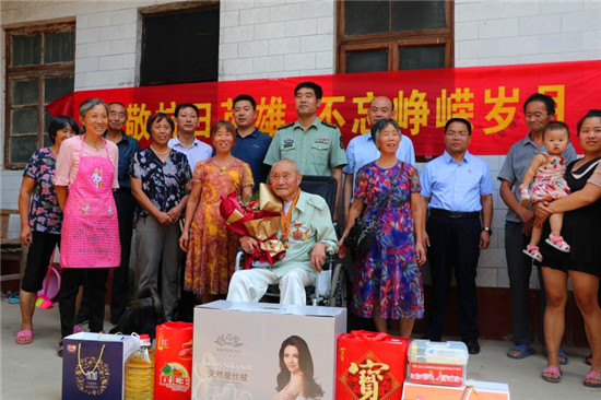 于永前一行來(lái)到楊廟鄉(xiāng)大祁行政村時(shí)已近中午,正趕上97歲抗日老戰(zhàn)士吳之太過(guò)生日。吳之太老少一家人歡聚一堂,其樂融融??吹轿繂?wèn)組的到來(lái),老人喜極而泣。吳之太老人擦著眼淚說(shuō):這些年沒少給黨和政府找麻煩,尤其是縣退役軍人事務(wù)局成立后,幫助他解決了好多困難和問(wèn)題,并定期來(lái)看望他,今天又見到大家,真不知道該說(shuō)什么好。潘布道代表退役軍人事務(wù)局向老人祝賀生日并告訴老人說(shuō):抗戰(zhàn)老戰(zhàn)士是民族的英雄、國(guó)家的財(cái)富,為黨的革命和建設(shè)作出了不可磨滅的貢獻(xiàn)。今后,將一如既往地關(guān)心和幫助抗戰(zhàn)老戰(zhàn)士,盡力幫助解決生活中的實(shí)際問(wèn)題,在全社會(huì)形成尊重抗戰(zhàn)老戰(zhàn)士、尊崇抗戰(zhàn)老戰(zhàn)士、關(guān)愛抗戰(zhàn)老戰(zhàn)士的良好氛圍。