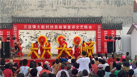 小小戲臺顯真情,脫貧攻堅(jiān)氣氛濃。8月28日下午,項(xiàng)城市水利局組織舉辦的“勠力同心攜手并進(jìn)·決戰(zhàn)決勝脫貧攻堅(jiān)”扶貧政策宣傳文藝演出活動(dòng)走進(jìn)三店鎮(zhèn)大趙村,為當(dāng)?shù)卮迕駧硪粓鼍式^倫的文化盛宴。