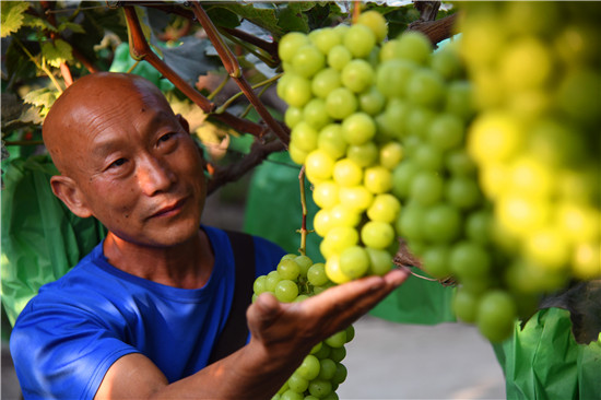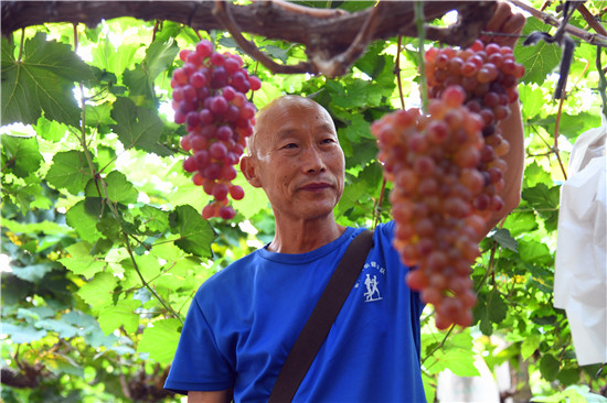 9月10日,商水縣農(nóng)業(yè)專(zhuān)家劉啟山在綠苑葡萄園內(nèi)察看葡萄生長(zhǎng)情況。