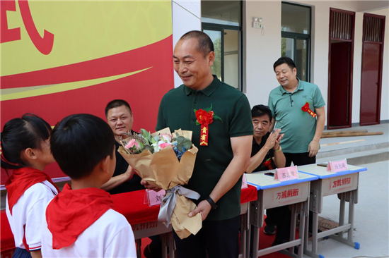 在熱烈祥和的氣氛中,方凱向杜崗小學(xué)校長(zhǎng)交付新建教學(xué)樓鑰匙。一把“金鑰匙”,蘊(yùn)含著一位人大代表、慈善家對(duì)莘莘學(xué)子的濃濃真情。紅花鎮(zhèn)中心小學(xué)校長(zhǎng)楊光華向方凱頒發(fā)杜崗小學(xué)終身名譽(yù)校長(zhǎng)證書(shū)。一份終身名譽(yù)校長(zhǎng)證書(shū),承載著一位人大代表、慈善家對(duì)教育事業(yè)的厚重責(zé)任。學(xué)生代表走上前臺(tái),向方凱叔叔致意、獻(xiàn)花,把儀式推向高潮。