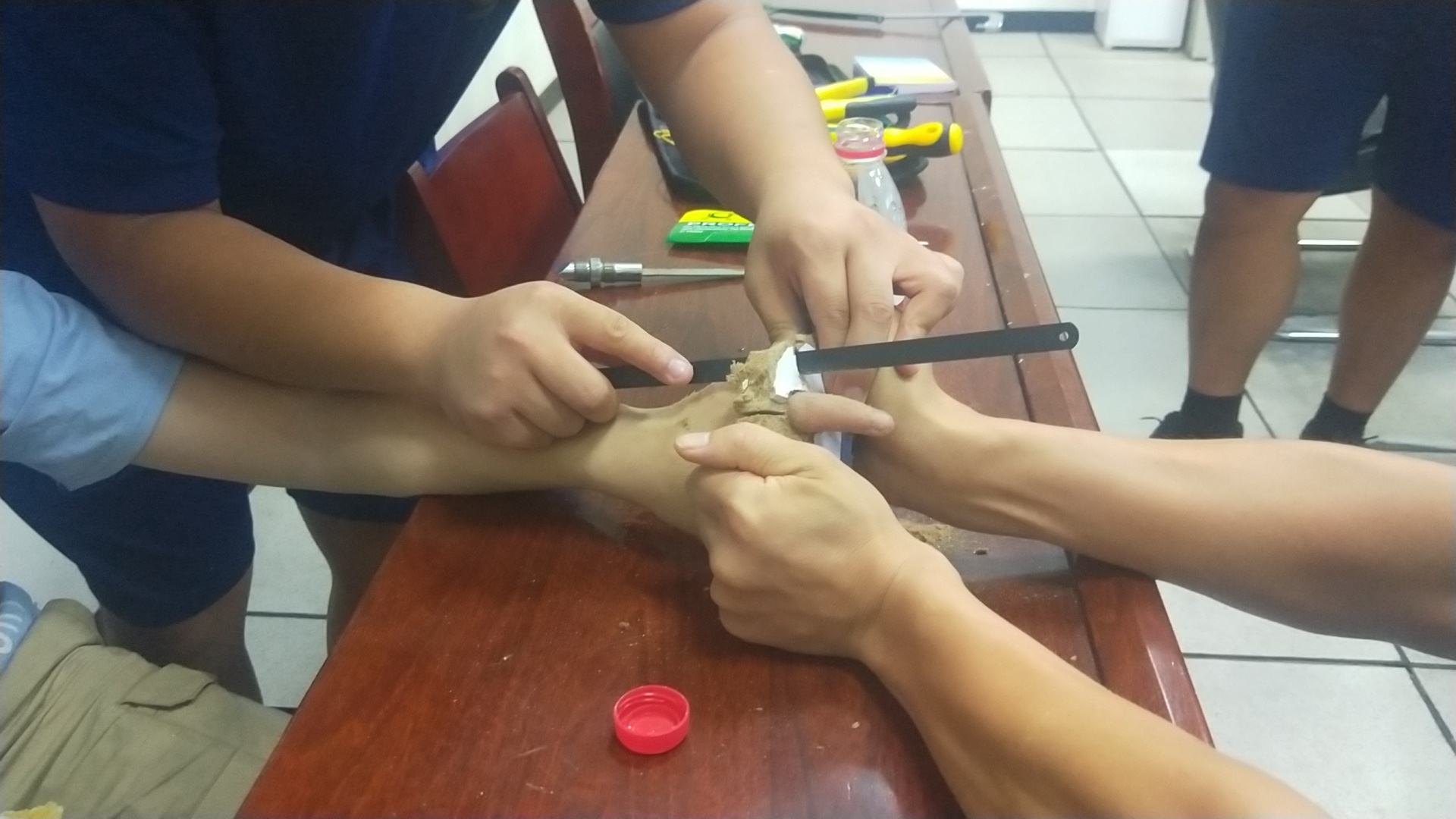 看到救援人員,小男孩十分害羞,有點不好意思?!拔铱醋雷由嫌袀€孔,就是想看看手指能不能伸進去,結果就拔不出來了?!本仍藛T經(jīng)觀察發(fā)現(xiàn),小男孩左手無名指被卡在課桌木板上的小孔里,木板已被裁下,木板材質(zhì)為鋸末壓縮板,此時小男孩手指被卡部位周圍已發(fā)生腫脹必須馬上處理。救援人員利用鋼鋸將木板一點點鋸開,然后又用鉗子用力將木板夾開,經(jīng)過3分鐘救援,成功將禁錮小男孩手指的木板摘除??吹侥景灞粡氖稚先∠拢泻㈤L長地舒了口氣。