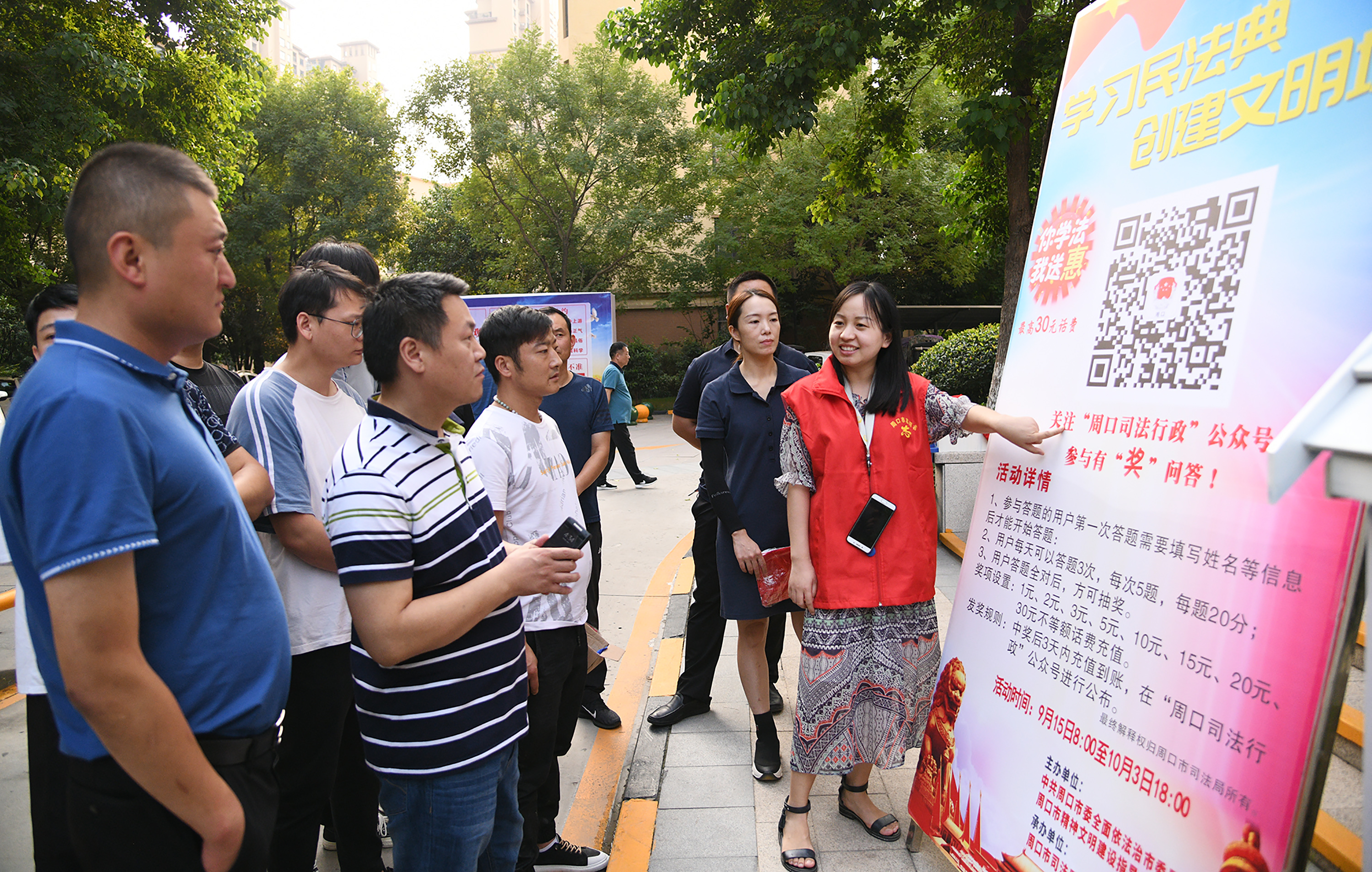 周口日報·新周口客戶端 我國于今年5月份頒布的《民法典》是一部被譽為“社會生活的百科全書”的法律,涉及民生諸多方面。近日,市司法部門深入社區(qū),以學法有獎形式,宣傳這部和老百姓生活密切相關的法律。圖為市司法部門工作人員在建業(yè)森林半島社區(qū)宣傳。記者 梁照曾 攝